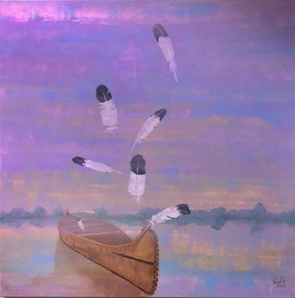 This painting was inspired by the tranquil waters of a morning canoe ride on the lake. As feathers float down over the water, a careful eye will also notice a Cherokee spirit in the sky.