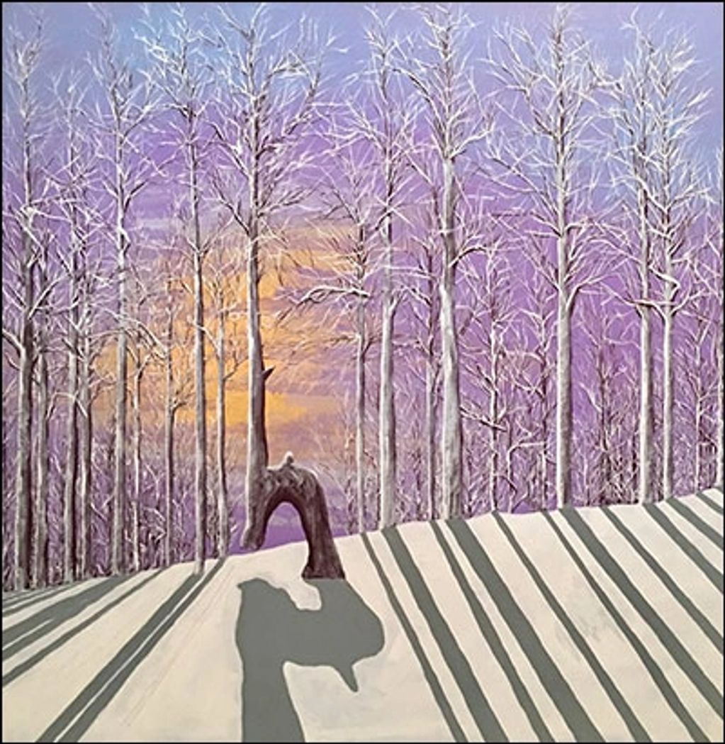 This painting was inspired by the amazing bent trees John Feight observed while hiking in North GA with his wife Linda. Years ago, the Cherokee tribe would bend a growing tree trunk to ensure it pointed towards the nearest water source.