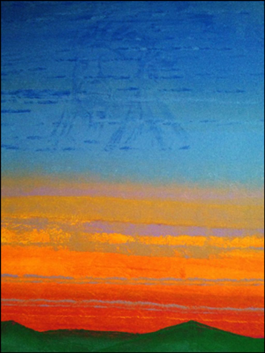This painting presents a vibrant sunset over the mountains of North Georgia with a Cherokee chief's spirit in the sky. In Cherokee culture, spirits are known to play a significant role in maintaining harmony.
