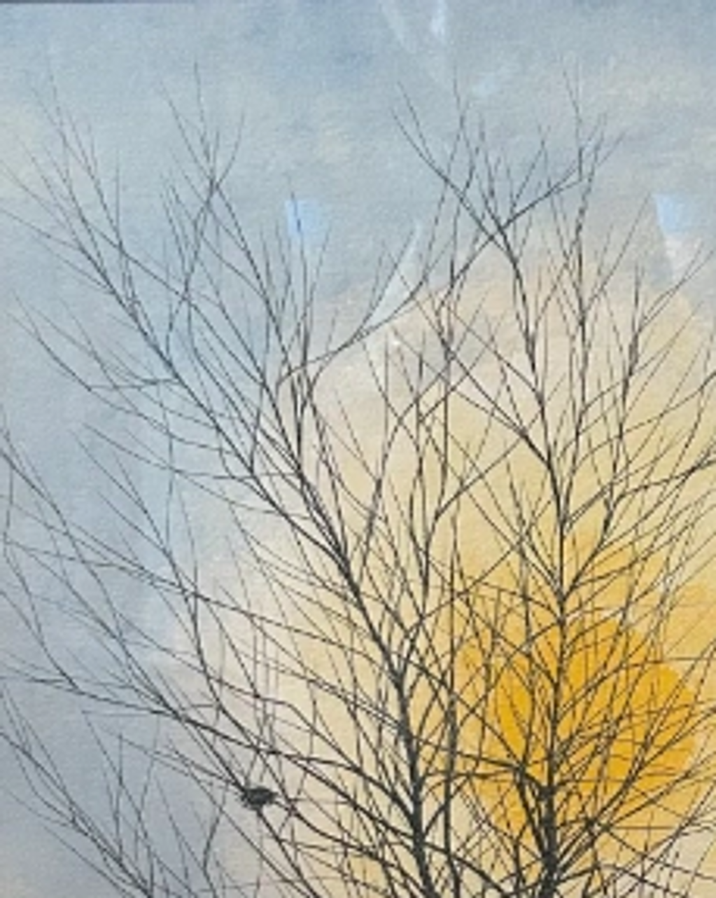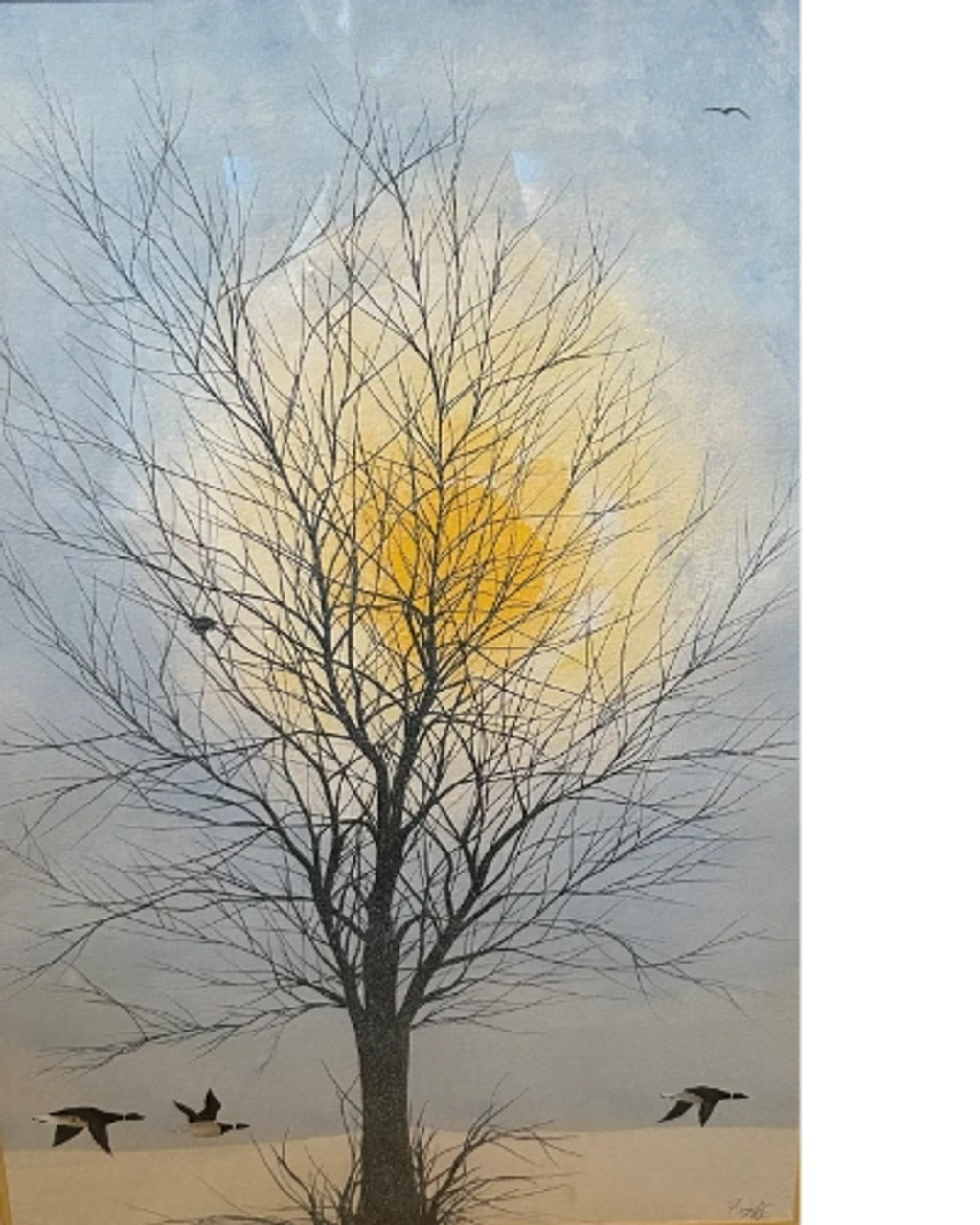 This painting is available for sale with a golden frame and pictures three geese migrating North for the Spring.