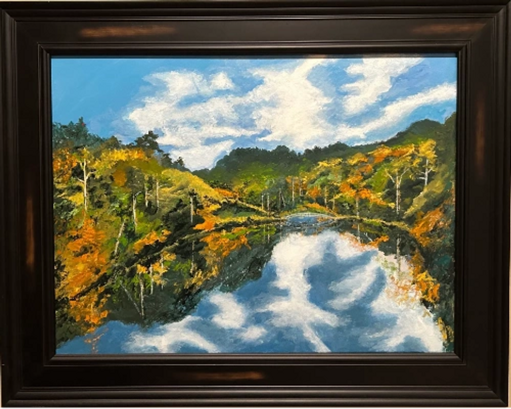 This painting provides the breathtaking view during the Fall from the top of the pedestrian footbridge over Toad's Pond in John's neighborhood within Big Canoe, GA.