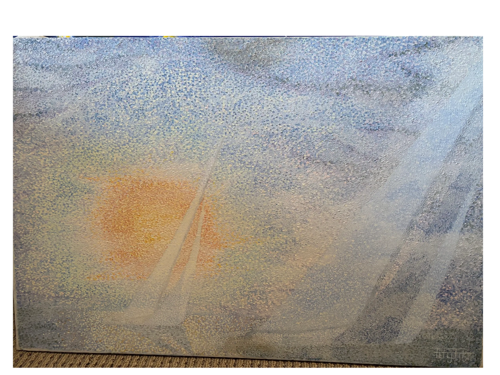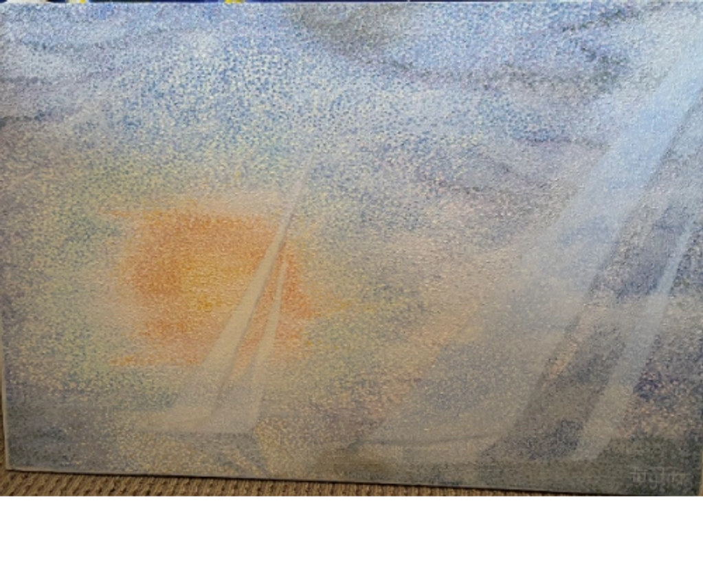This painting features the pointillism style, the aggregation of several small dots to create an image of large sailboats on the water.