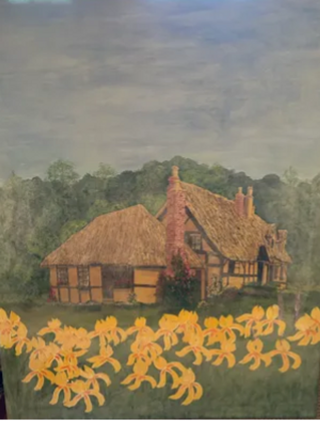 This painting depicts a field of vibrant yellow daylilies in front of a cozy English cottage.