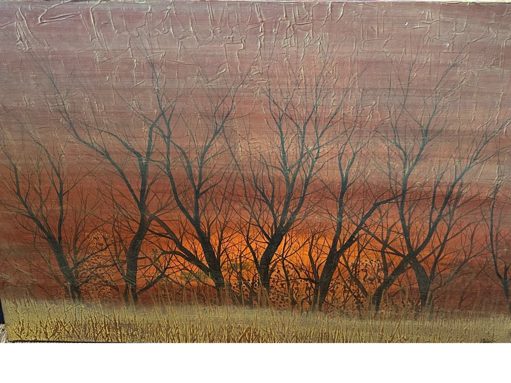 This painting presents a beautiful orange sunrise over the Serengeti in East Africa. If you look closely, you'll spot a family of cheetahs tucked behind the trees.