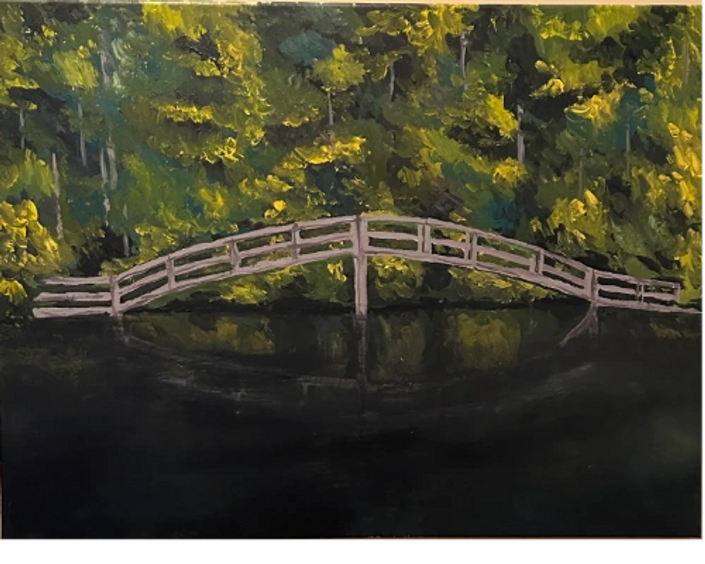This painting features the lush trees that surround Toad's Pond in North Georgia. The pedestrian footbridge in the center is part of a path that John and his wife Linda often take during their evening walks around their neighborhood in Big Canoe, GA.