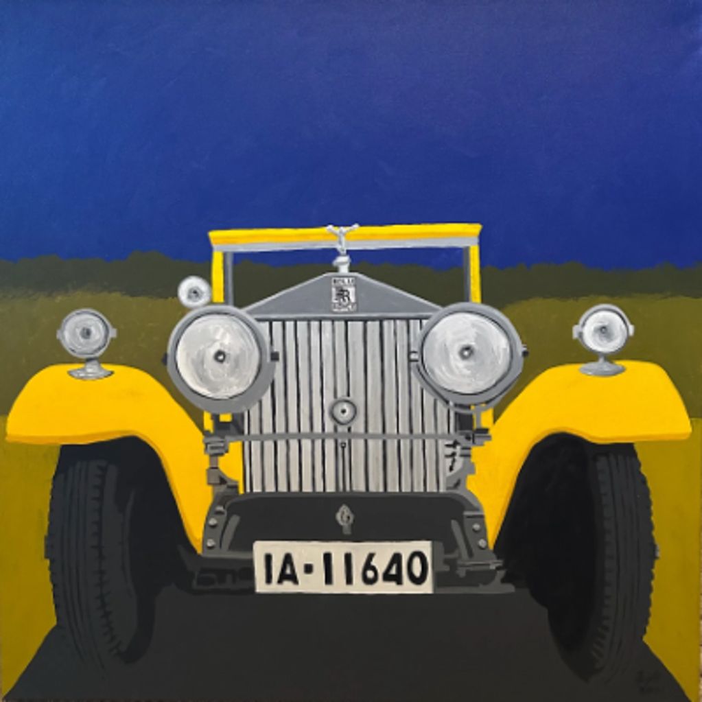 This painting features a bright yellow Rolls-Royce motor car, inspired by one of the first paintings sold John at auction in Belgium which depicted a Rolls-Royce.