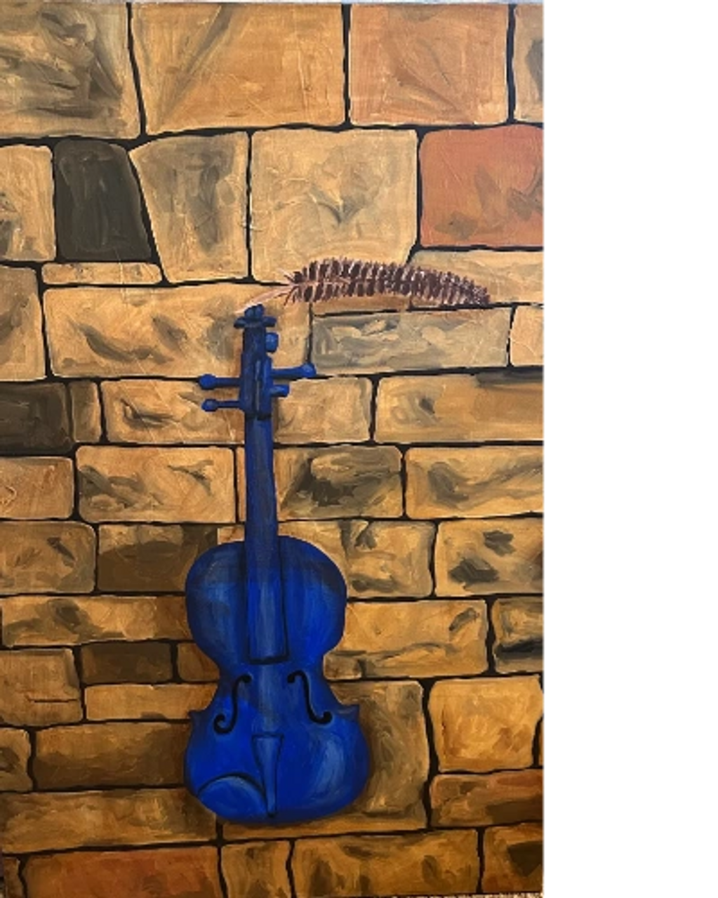 This painting depicts a violin which John found abandoned along the dumpsters in his neighborhood. He brought the violin home to his art studio and painted it with bright blue acrylic paint just for fun, and before long, the blue violin had its own portrait!