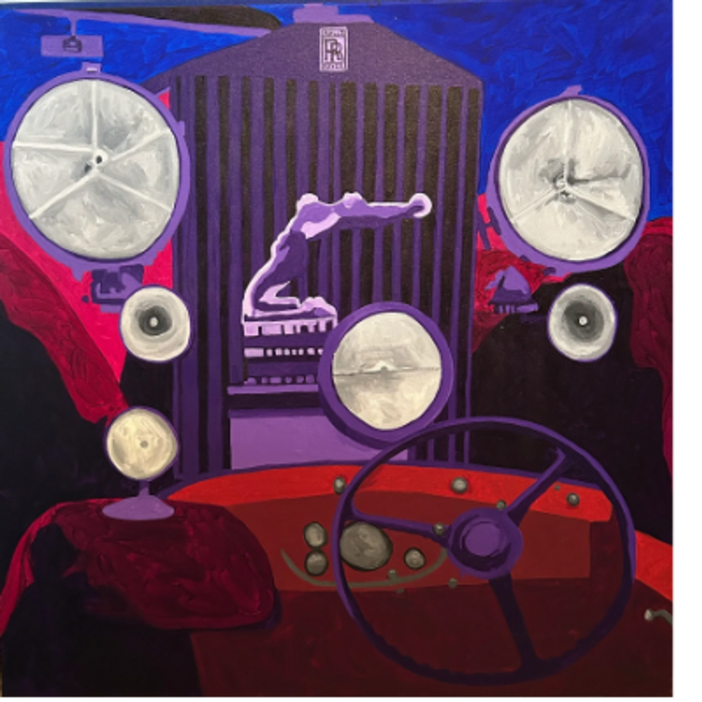 This painting focuses on the hood ornament and headlights of a Rolls-Royce motor car.