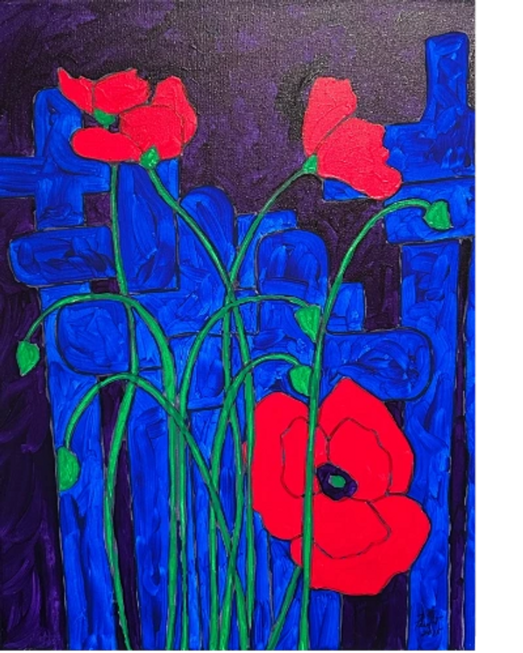 This painting takes primary colors to the next level as bright red poppies grow amid a collection of bold blue crosses.