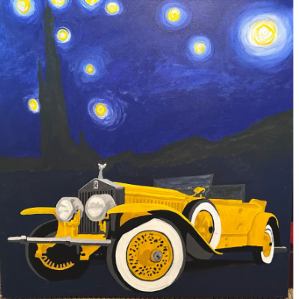 This painting was inspired by Van Gogh's famous painting "Starry Night", with a twist, as a bright yellow Rolls-Royce motor car pulling up in style in the foreground.